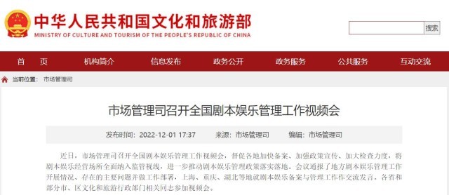 文旅部:將劇本娛樂經營場所全麵納入監管視線
