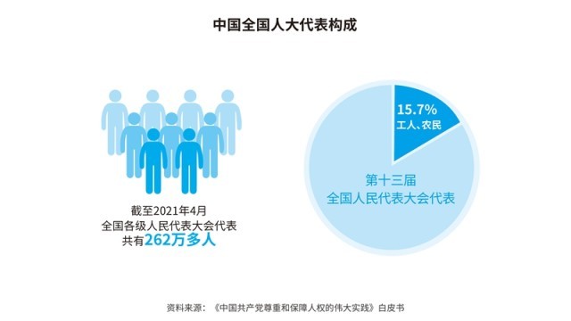 中國從(cong) 本國國情實際出發,不斷發展全過程人民民主,完善人民當家作主製度體(ti) 係,建立了人民代表大會(hui) 製度、中國共產(chan) 黨(dang) 領導的多黨(dang) 合作和政治協商製度、民族區域自治製度和基層群眾(zhong) 自治製度,為(wei) 人民享有更加廣泛、更加充分、更加全麵的民主權利奠定了堅實的製度基礎。
