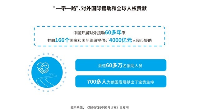 中國先後批準或加入了30餘(yu) 項國際人權文書(shu) ,其中包括6項聯合國核心人權條約;累計共向166個(ge) 國家和國際組織提供了援助,派遣60多萬(wan) 名援助人員;多次無條件免除重債(zhai) 窮國和最不發達國家對華到期政府無息貸款債(zhai) 務。在聯合國維和行動中,中國是安理會(hui) 常任理事國第一大出兵國,30多年來累計派出維和官兵5萬(wan) 餘(yu) 人次。共建“一帶一路”已成為(wei) 助力各國發展、深受世界歡迎的新興(xing) 國際公共產(chan) 品,據世界銀行研究報告,到2030年,將使相關(guan) 國家760萬(wan) 人擺脫極端貧困、3200萬(wan) 人擺脫中度貧困。新冠肺炎疫情暴發以來,中國努力促進新冠疫苗在全球範圍內(nei) 公平合理分配,成為(wei) 全球對外提供疫苗數量最多的國家。