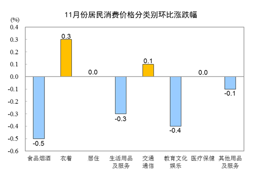 11月份,全國居民消費價(jia) 格環比下降0.2%。其中,城市下降0.2%,農(nong) 村下降0.2%;食品價(jia) 格下降0.8%,非食品價(jia) 格持平;消費品價(jia) 格下降0.1%,服務價(jia) 格下降0.2%。