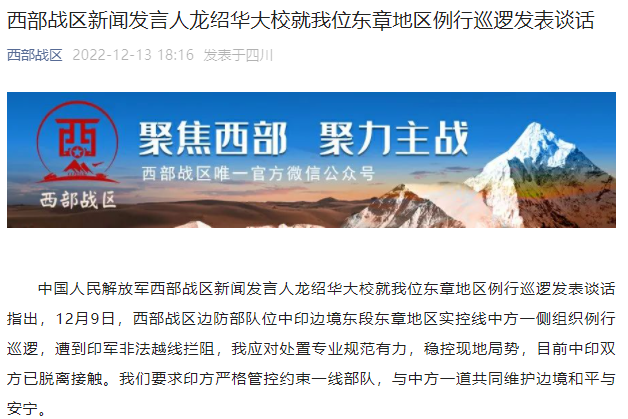 中國人民解放軍(jun) 西部戰區新聞發言人龍紹華大校就我位東(dong) 章地區例行巡邏發表談話指出,12月9日,西部戰區邊防部隊位中印邊境東(dong) 段東(dong) 章地區實控線中方一側(ce) 組織例行巡邏,遭到印軍(jun) 非法越線攔阻,我應對處置專(zhuan) 業(ye) 規範有力,穩控現地局勢,目前中印雙方已脫離接觸。我們(men) 要求印方嚴(yan) 格管控約束一線部隊,與(yu) 中方一道共同維護邊境和平與(yu) 安寧。