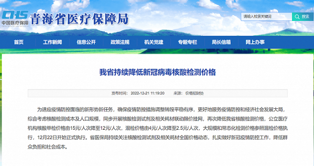 據青海省醫療保障局網站消息,為(wei) 適應疫情防控麵臨(lin) 的新形勢新任務,確保疫情防控措施調整轉段平穩有序,更好地服務疫情防控和經濟社會(hui) 發展大局,綜合考慮核酸檢測成本及人口規模,同步開展核酸檢測試劑及相關(guan) 耗材聯動限價(jia) 掛網,再次降低青海省核酸檢測價(jia) 格,公立醫療機構核酸單檢價(jia) 格由15元/人次降至12元/人次,混檢價(jia) 格由4元/人次降至2.5元/人次,大規模和常態化檢測價(jia) 格參照混檢價(jia) 格執行,12月22日開始正式執行。省醫保局持續關(guan) 注核酸檢測試劑及相關(guan) 耗材全國價(jia) 格動態,紮實做好新冠疫情防控工作,降低群眾(zhong) 負擔和社會(hui) 成本。
