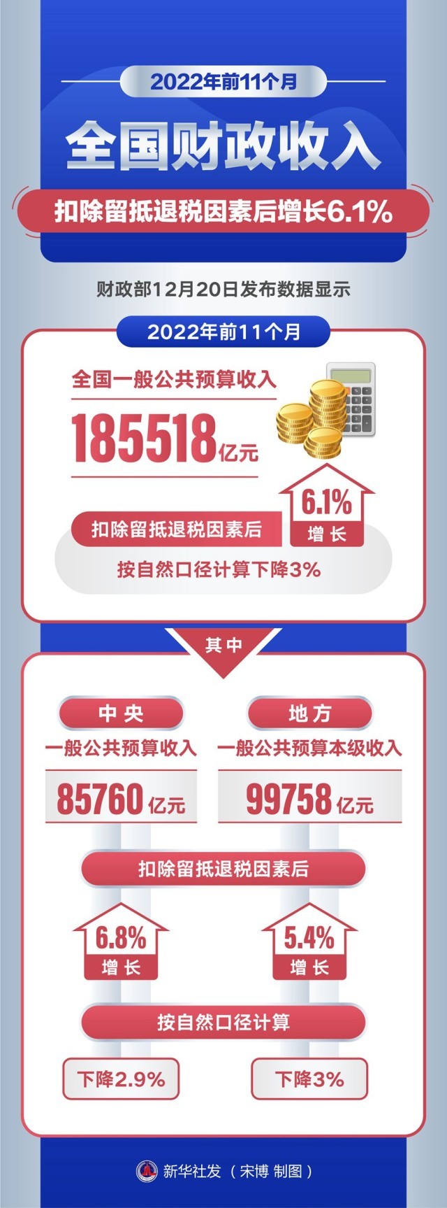 前11個月全國財政收入扣除留抵退稅因素後增長6.1%