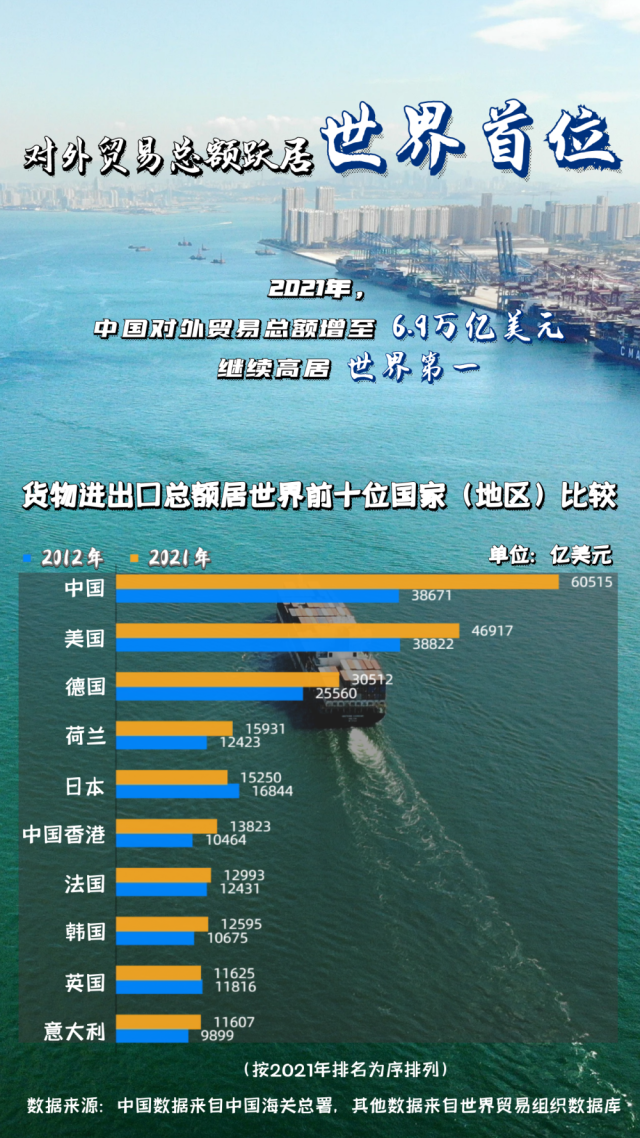 2020年中國對外貿易總額由2012年的4.4萬(wan) 億(yi) 美元升至5.3萬(wan) 億(yi) 美元,首超美國成為(wei) 全球第一大貿易國。2021年,中國對外貿易總額加快上升增至6.9萬(wan) 億(yi) 美元,繼續高居世界第一。在經濟全球化頻遭單邊主義(yi) 、保護主義(yi) 等“逆流”襲擾的曆史當口,中國從(cong) 融入和適應全球化走向推動和引領全球化,積極倡導建設開放型世界經濟,推動經濟全球化朝著更加開放、包容、普惠、平衡、共贏方向發展。目前,中國已成為(wei) 140多個(ge) 國家和地區的主要貿易夥(huo) 伴,形成更大範圍、更寬領域、更深層次對外開放格局。