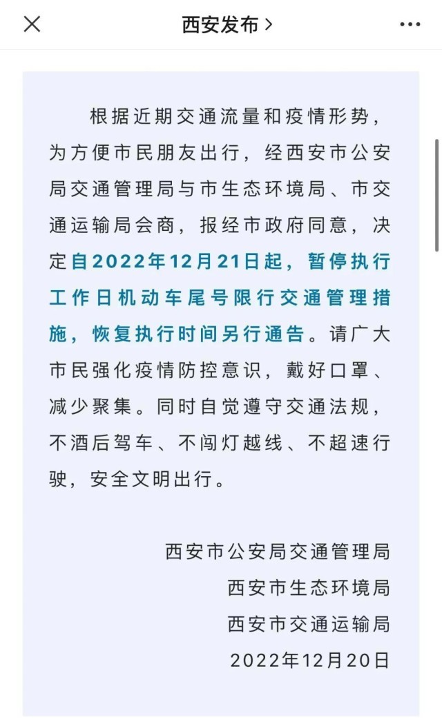 12月20日,陝西西安多部門發布通知,根據近期交通流量和疫情形勢,為(wei) 方便市民朋友出行,決(jue) 定自2022年12月21日起,暫停執行工作日機動車尾號限行交通管理措施,恢複執行時間另行通告。