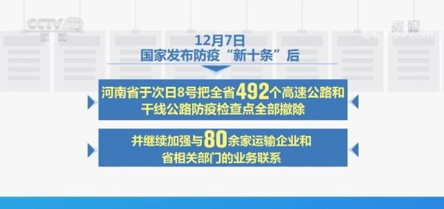 據了解,12月7日,國家發布防疫“新十條”後,河南省於(yu) 次日把全省492個(ge) 高速公路和幹線公路防疫檢查點全部撤除,並繼續加強與(yu) 80餘(yu) 家運輸企業(ye) 和省相關(guan) 部門的業(ye) 務聯係,充分發揮“12328服務監督熱線+三級調度”機製作用,每日收集運輸受阻問題,以便及時解決(jue) 問題。