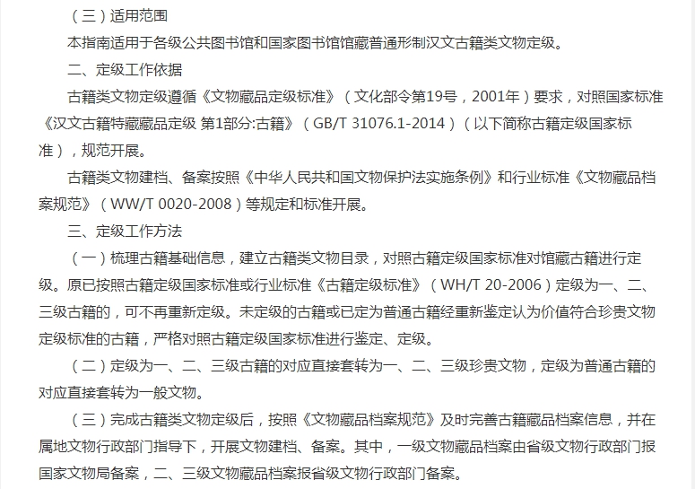 定級為(wei) 一、二、三級古籍的對應直接套轉為(wei) 一、二、三級珍貴文物,定級為(wei) 普通古籍的對應直接套轉為(wei) 一般文物。