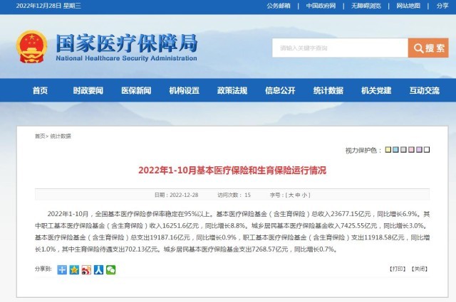 央視網消息:國家醫療保障局網站12月28日消息,2022年1-10月,全國基本醫療保險參保率穩定在95%以上。基本醫療保險基金(含生育保險)總收入23677.15億(yi) 元,同比增長6.9%。其中職工基本醫療保險基金(含生育保險)收入16251.6億(yi) 元,同比增長8.8%。城鄉(xiang) 居民基本醫療保險基金收入7425.55億(yi) 元,同比增長3.0%。基本醫療保險基金(含生育保險)總支出19187.16億(yi) 元,同比增長0.9%,職工基本醫療保險基金(含生育保險)支出11918.58億(yi) 元,同比增長1.0%,其中生育保險待遇支出702.13億(yi) 元。城鄉(xiang) 居民基本醫療保險基金支出7268.57億(yi) 元,同比增長0.7%。