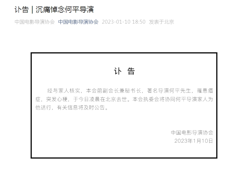 中新網1月10日電 據中國電影導演協會(hui) 消息,經與(yu) 家人核實,中國電影導演協會(hui) 前副會(hui) 長兼秘書(shu) 長,著名導演何平先生,罹患癌症,突發心梗,於(yu) 1月10日淩晨在北京去世。中國電影導演協會(hui) 執委會(hui) 將協同何平導演家人為(wei) 他送行,有關(guan) 信息將及時公告。