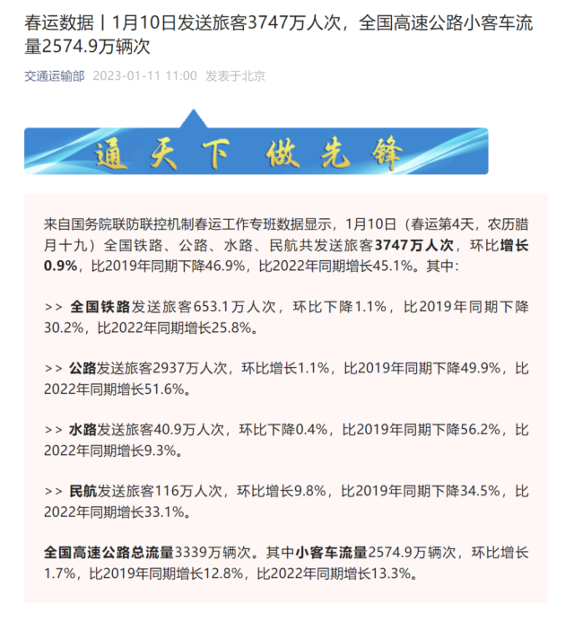 來自國務院聯防聯控機製春運工作專(zhuan) 班數據顯示,1月10日(春運第4天,農(nong) 曆臘月十九)全國鐵路、公路、水路、民航共發送旅客3747萬(wan) 人次,環比增長0.9%,比2019年同期下降46.9%,比2022年同期增長45.1%。其中: