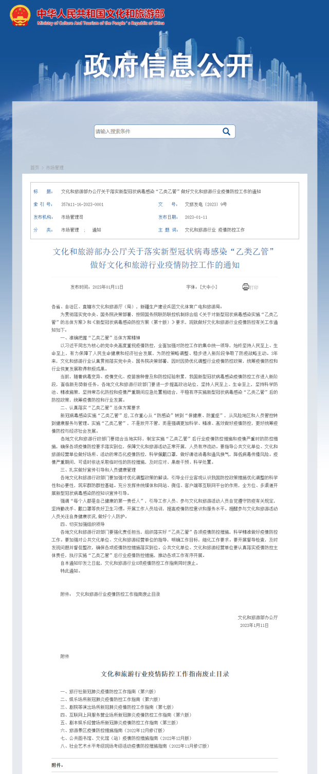 為(wei) 貫徹落實黨(dang) 中央、國務院決(jue) 策部署,按照國務院聯防聯控機製綜合組《關(guan) 於(yu) 對新型冠狀病毒感染實施“乙類乙管”的總體(ti) 方案》和《新型冠狀病毒感染防控方案(第十版)》要求,現就做好文化和旅遊行業(ye) 疫情防控有關(guan) 工作通知如下: