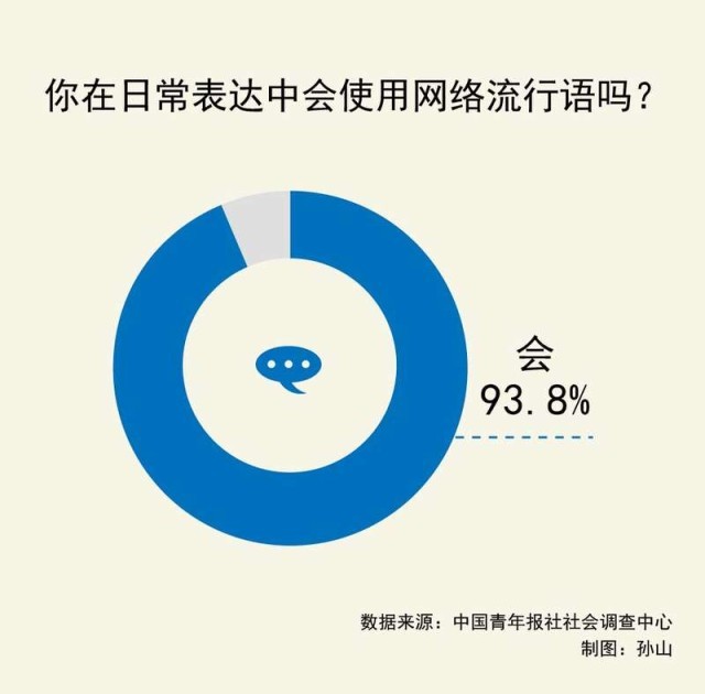 數據顯示,93.8%的受訪青年會(hui) 在日常表達中使用網絡流行語,90後的比例更高(95.9%)。