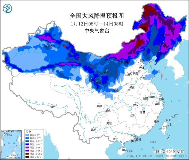 預計,1月12日8時至1月14日8時,新疆沿天山以北、甘肅大部、寧夏、陝西北部、內(nei) 蒙古大部、東(dong) 北地區等地部分地區將先後降溫8~12℃,其中,新疆沿天山以北、內(nei) 蒙古中東(dong) 部、黑龍江中東(dong) 部、吉林東(dong) 部、遼寧東(dong) 北部等地部分地區降溫14~16℃,局地可超過18~20℃。新疆東(dong) 部、甘肅中西部、內(nei) 蒙古大部、東(dong) 北地區、華北等地有6~8級大風,新疆山口風力可達9~11級或以上。東(dong) 部海區有7~9級風,陣風可達10~11級。新疆東(dong) 部和南部、青海西北部、甘肅西部和東(dong) 部、內(nei) 蒙古西部、寧夏、陝西北部等地有揚沙或浮塵,局地有沙塵暴。