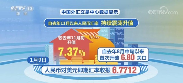 從(cong) 去年底到今年開年至今,人民幣匯率走出了一波反彈回升行情。中國外匯交易中心數據顯示,自去年11月以來人民幣匯率持續震蕩升值。1月9日人民幣對美元即期匯率收報6.7712,較去年11月初升值7.37%,也是自去年8月中旬以來首次升破6.80關(guan) 口。