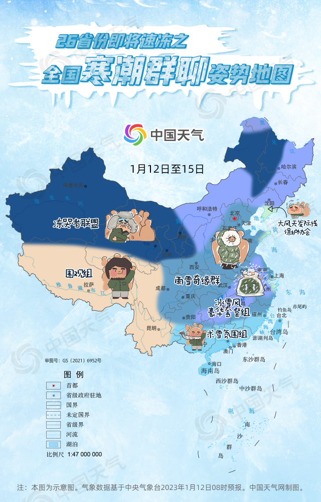 1月12日,2023年首場寒潮已抵達內(nei) 蒙古一帶,未來幾天將大舉(ju) 南下橫掃我國大部,中央氣象台已升級發布寒潮黃色預警,約26省區市即將加入寒潮群聊。哪裏將加入“凍哭者聯盟”?哪裏將獲得“冰雪風超級豪華套餐”?哪裏與(yu) 雪無緣默默充當“求雪氛圍組”?中國天氣網推出全國寒潮群聊姿勢地圖,請各位對號入座掃碼進群!