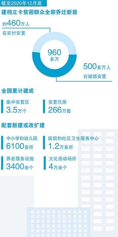 習(xi) 近平總書(shu) 記強調:“易地搬遷是解決(jue) 一方水土養(yang) 不好一方人、實現貧困群眾(zhong) 跨越式發展的根本途徑,也是打贏脫貧攻堅戰的重要途徑。”黨(dang) 的十八大以來,全國累計建成集中安置區3.5萬(wan) 個(ge) 、安置住房266萬(wan) 套。到2020年底,全國易地扶貧搬遷規劃建設任務全麵完成,近千萬(wan) 生活在“一方水土難養(yang) 一方人”地方的建檔立卡貧困人口實現易地扶貧搬遷,搬入新家園、開啟新生活。