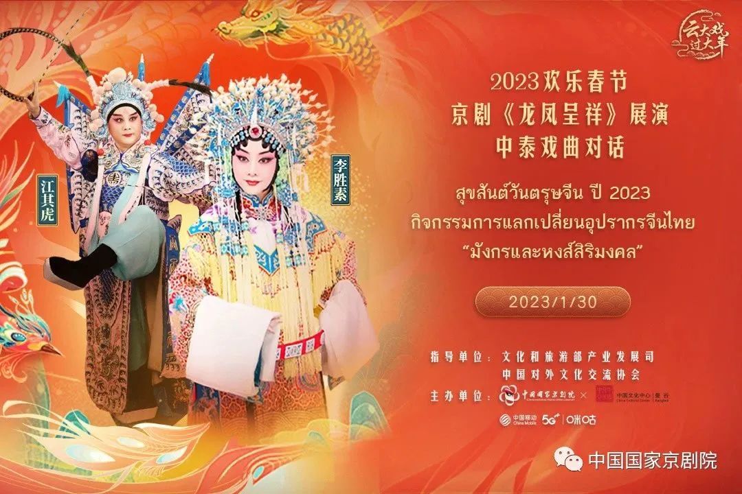 中新網北京1月31日電 據國家京劇院消息,1月30日,濃濃的年味還未散盡,國家京劇院一團團長、一級演員李勝素,一級演員江其虎等,攜經典大戲《龍鳳呈祥》演播參加曼穀中國文化中心歡樂(le) 春節係列活動之一——“京劇《龍鳳呈祥》演播·中泰戲曲對話”活動。劇院藝術家與(yu) 泰國觀眾(zhong) “雲(yun) 端”相見,京劇《龍鳳呈祥》以線上演播的形式,與(yu) 泰國優(you) 泰劇展開對話,共慶喜慶祥和的傳(chuan) 統佳節。中國駐泰國大使館臨(lin) 時代辦楊欣專(zhuan) 門以視頻形式致辭,泰國文化部副常秘玉提佳女士出席活動並代表泰國文化部致辭,曼穀中國文化中心兼駐曼穀旅遊辦主任闕小華、曼穀中國文化中心副主任趙歆等近200位各界人士現場參與(yu) 了活動。