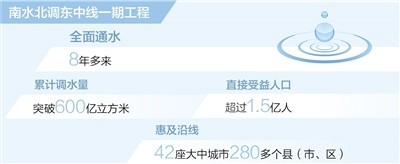 本報北京2月5日電 (記者王浩)記者從(cong) 水利部、中國南水北調集團獲悉:截至2月5日,南水北調東(dong) 中線一期工程(含東(dong) 線一期工程北延應急供水工程)累計調水量突破600億(yi) 立方米,惠及沿線42座大中城市280多個(ge) 縣(市、區),直接受益人口超過1.5億(yi) 人。按照黃河多年平均天然徑流量580億(yi) 立方米計算,相當於(yu) 為(wei) 北方地區調來了超過黃河一年的水量。