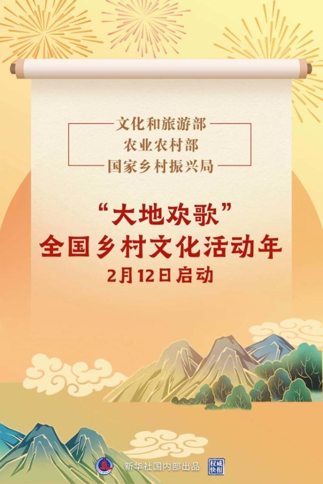 為(wei) 深入實施鄉(xiang) 村振興(xing) 戰略,全麵推進鄉(xiang) 村文化振興(xing) ,文化和旅遊部、農(nong) 業(ye) 農(nong) 村部、國家鄉(xiang) 村振興(xing) 局2月12日在湖北省武漢市啟動“大地歡歌”全國鄉(xiang) 村文化活動年。