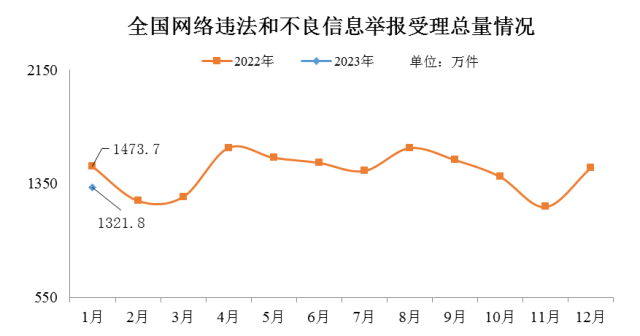 2023年1月全國受理網絡違法和不良信息舉報1321.8萬件