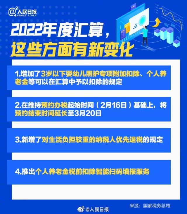 2022年度個(ge) 稅匯算將於(yu) 3月1日起開始,2月16日起可以提前預約辦稅。納稅人如需在3月1日至3月20日之間辦理年度匯算,可在2月16日至3月20日每天的早6點至晚22點登錄手機個(ge) 人所得稅APP進行預約。2022年度退補稅怎麽(me) 辦理?2022年度匯算新變化又有哪些?詳戳