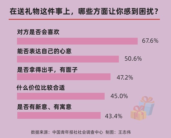 中國青年報社社會(hui) 調查中心的調查顯示,在送禮物上,69.9%的受訪青年感到有困擾,且男生有困擾的比例高於(yu) 女生,這也從(cong) 一定程度上反映出男生在禮物選擇和情感表達上更為(wei) 糾結。