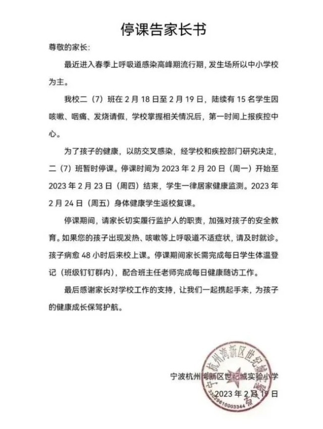 這兩(liang) 天,寧波杭州灣新區世紀城實驗小學發布停課通知,引起了許多網友的關(guan) 注。