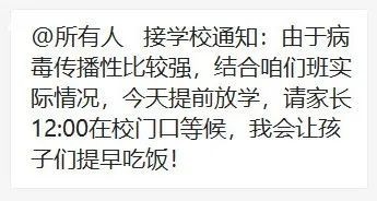 今天(2月20日)早上,一張截圖在部分金華市民朋友圈中傳(chuan) 播。金華一學校發布了提前放學通知:“由於(yu) 病毒傳(chuan) 播性比較強,結合咱們(men) 班實際情況,今天提前放學,請家長12:00在校門口等候。”