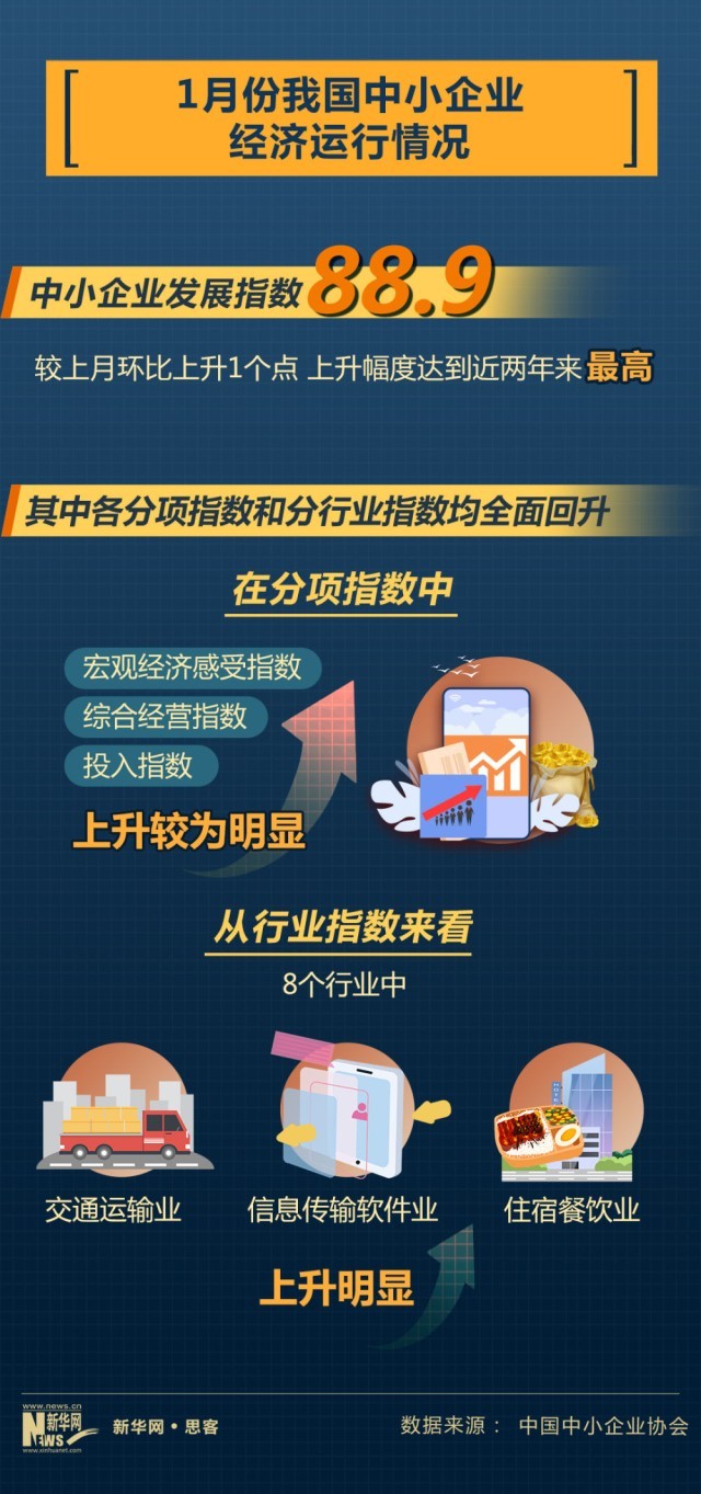 近日中國中小企業(ye) 協會(hui) 公布我國中小企業(ye) 經濟運行情況。2023年1月份,中國中小企業(ye) 發展指數為(wei) 88.9,比去年12月回升1個(ge) 點,上升幅度達到近兩(liang) 年來最高。其中,企業(ye) 發展信心回升,反映企業(ye) 信心狀況的宏觀經濟感受指數為(wei) 98.7,比上月上升2.1點。市場預期有所提振,市場指數為(wei) 80.7,環比上升0.9點。