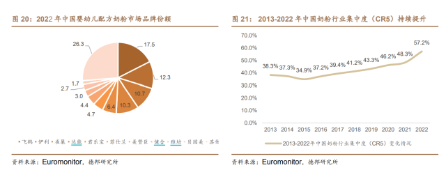 國泰君安2022年12月19日發布的研報指出,新國標落地,預計約20%的中小品牌市場份額將進一步向前十家奶粉企業(ye) 集中,在“十強”內(nei) 部,也會(hui) 出現市場份額向頭部3至5家奶粉企業(ye) 集中的趨勢,國內(nei) 奶粉行業(ye) 前三家奶粉企業(ye) 合計占有的市場份額有望從(cong) 2021年的40%提升至長期的60%至70%。