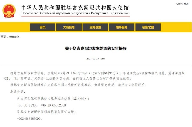 駐塔吉克斯坦使館提醒廣大旅塔中國公民做好防震準備,如遇緊急狀況,請及時與(yu) 使館聯係。