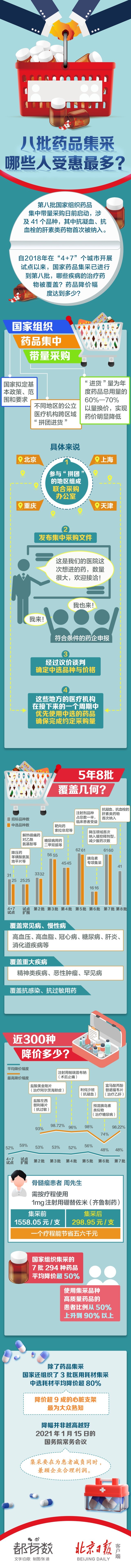 自2018年在“4+7”個(ge) 城市開展試點以來,國家藥品集采已進行到第八批,哪些疾病的治療藥物被覆蓋?藥品降價(jia) 幅度達到多少?