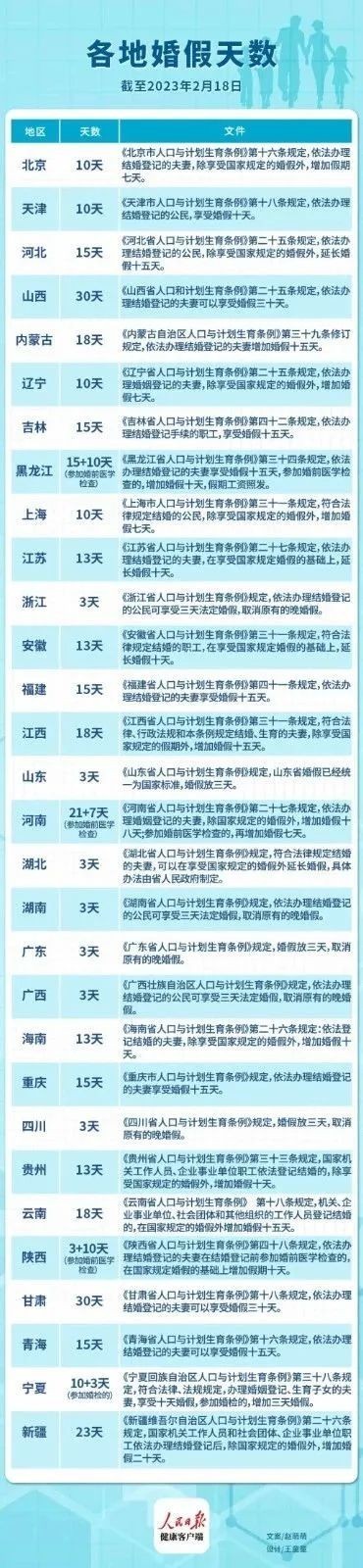 在一份全國各地婚假天數表中,具體(ti) 的婚假天數,各省的差距頗大。其中,浙江等省份隻有3天。