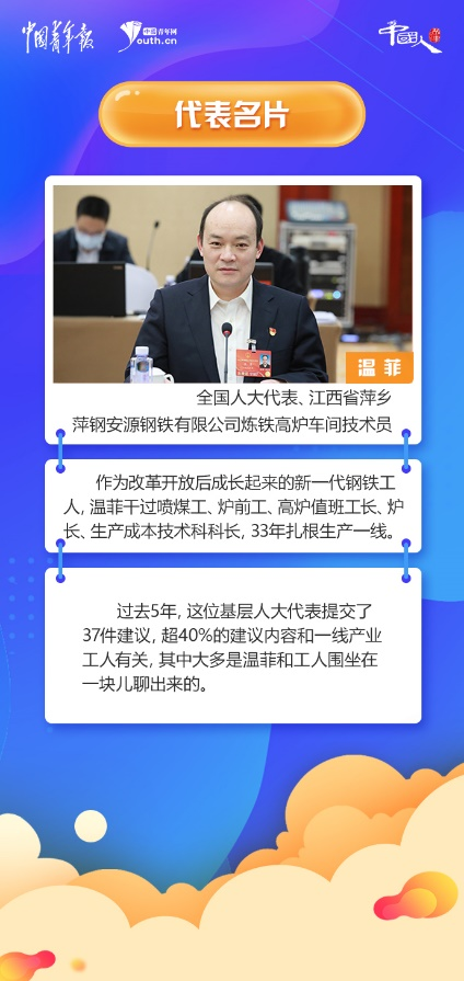 作為(wei) 改革開放後成長起來的新一代鋼鐵工人,溫菲幹過噴煤工、爐前工、高爐值班工長、爐長、生產(chan) 成本技術科科長,33年紮根生產(chan) 一線。過去5年,這位基層人大代表提交了37件建議,超40%的建議內(nei) 容和一線產(chan) 業(ye) 工人有關(guan) ,其中大多是溫菲和工人圍坐在一塊兒(er) 聊出來的。
