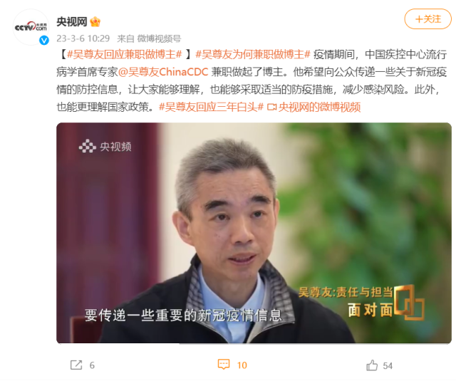 疫情期間,吳尊友兼職做起了博主。他希望向公眾(zhong) 傳(chuan) 遞一些關(guan) 於(yu) 新冠疫情的防控信息,讓大家能夠理解,也能夠采取適當的防疫措施,減少感染風險。此外,也能更理解國家政策。