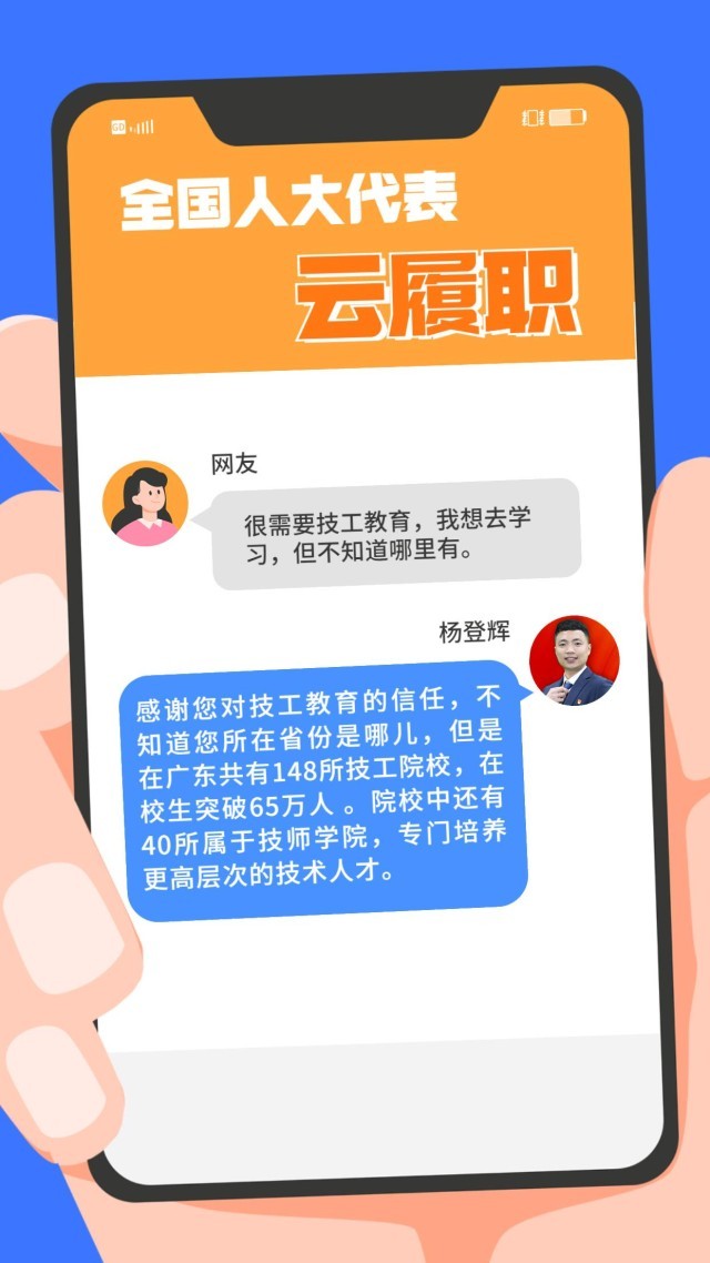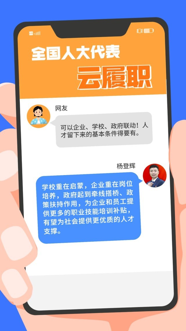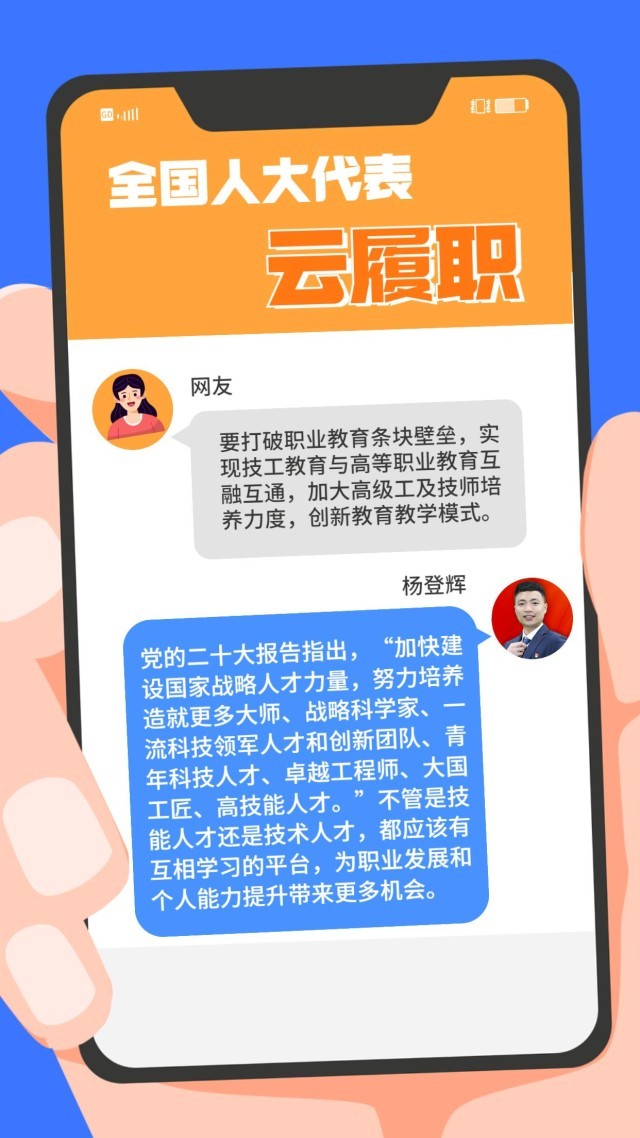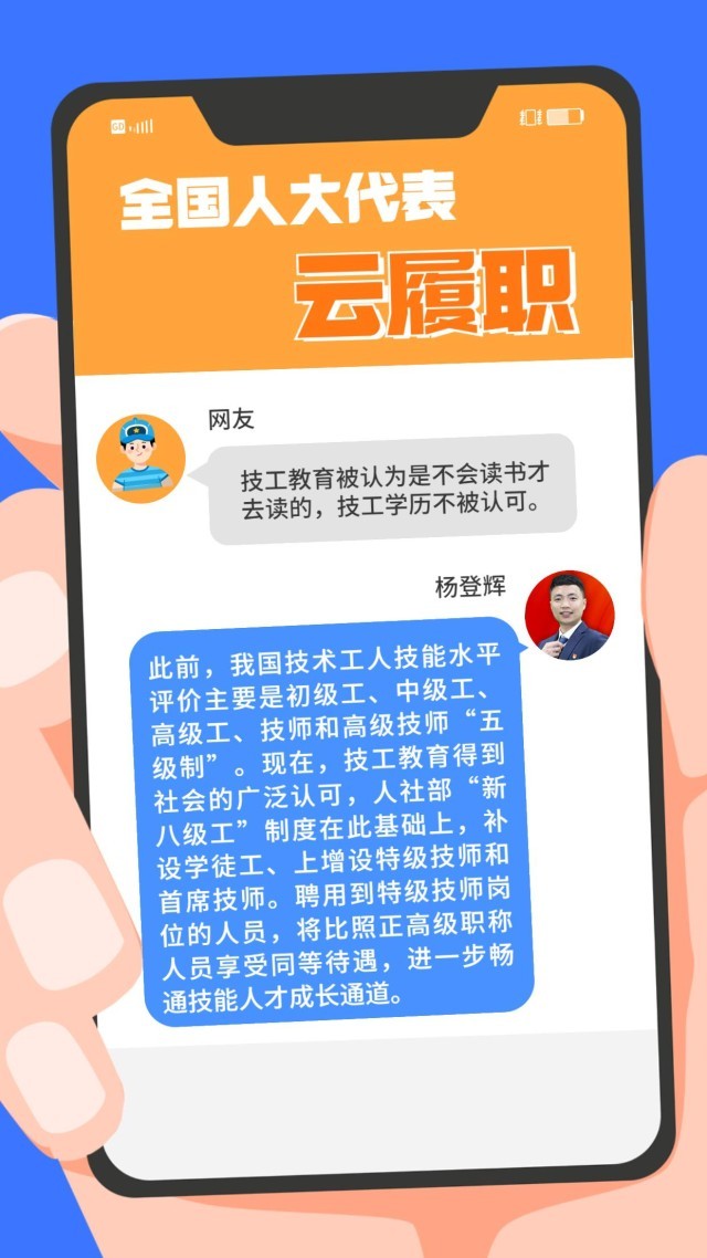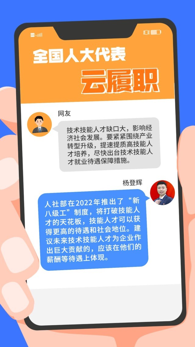 現實中,“技能人才短缺”現象頻頻出現。針對技能人才的供給與(yu) 產(chan) 業(ye) 發展的實際需求在規模、結構和質量上不對稱、不適應等問題,全國人大代表、第44屆世界技能大賽冠軍(jun) 楊登輝在赴京履職前,通過線上方式征求網友的意見。對部分有代表性的留言,楊登輝一一作了回複。來看看這位95後全國人大代表怎麽(me) 說↓↓↓