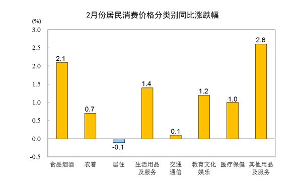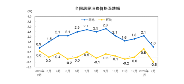 2月份居民消費價格同比上漲1.0% 環比下降0.5%