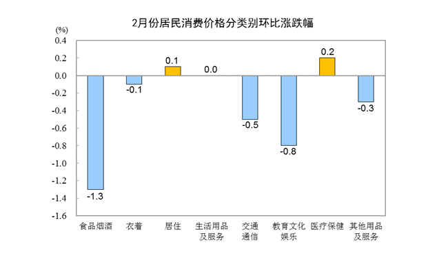 2月份,全國居民消費價(jia) 格環比下降0.5%。其中,城市下降0.5%,農(nong) 村下降0.5%;食品價(jia) 格下降2.0%,非食品價(jia) 格下降0.2%;消費品價(jia) 格下降0.6%,服務價(jia) 格下降0.4%。