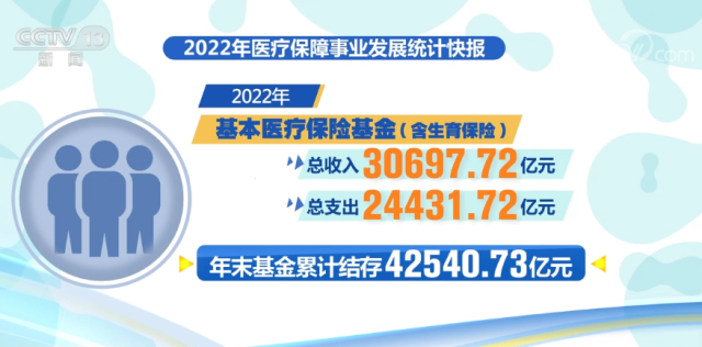 2022年,基本醫療保險基金(含生育保險)總收入、總支出分別為(wei) 30697.72億(yi) 元、24431.72億(yi) 元,年末基金累計結存42540.73億(yi) 元。