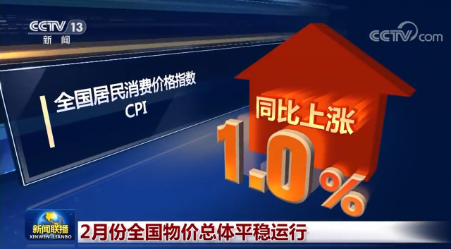 央視網消息(新聞聯播):國家統計局今天(3月9日)發布數據顯示,2月份,受市場供應充足等因素影響,全國居民消費價(jia) 格指數(CPI)同比上漲1.0%,漲幅比上月回落1.1個(ge) 百分點,物價(jia) 總體(ti) 平穩運行。