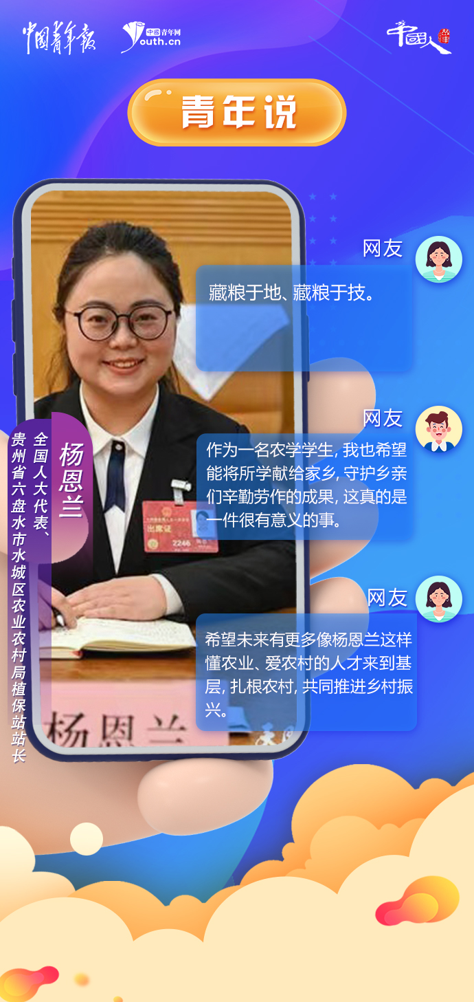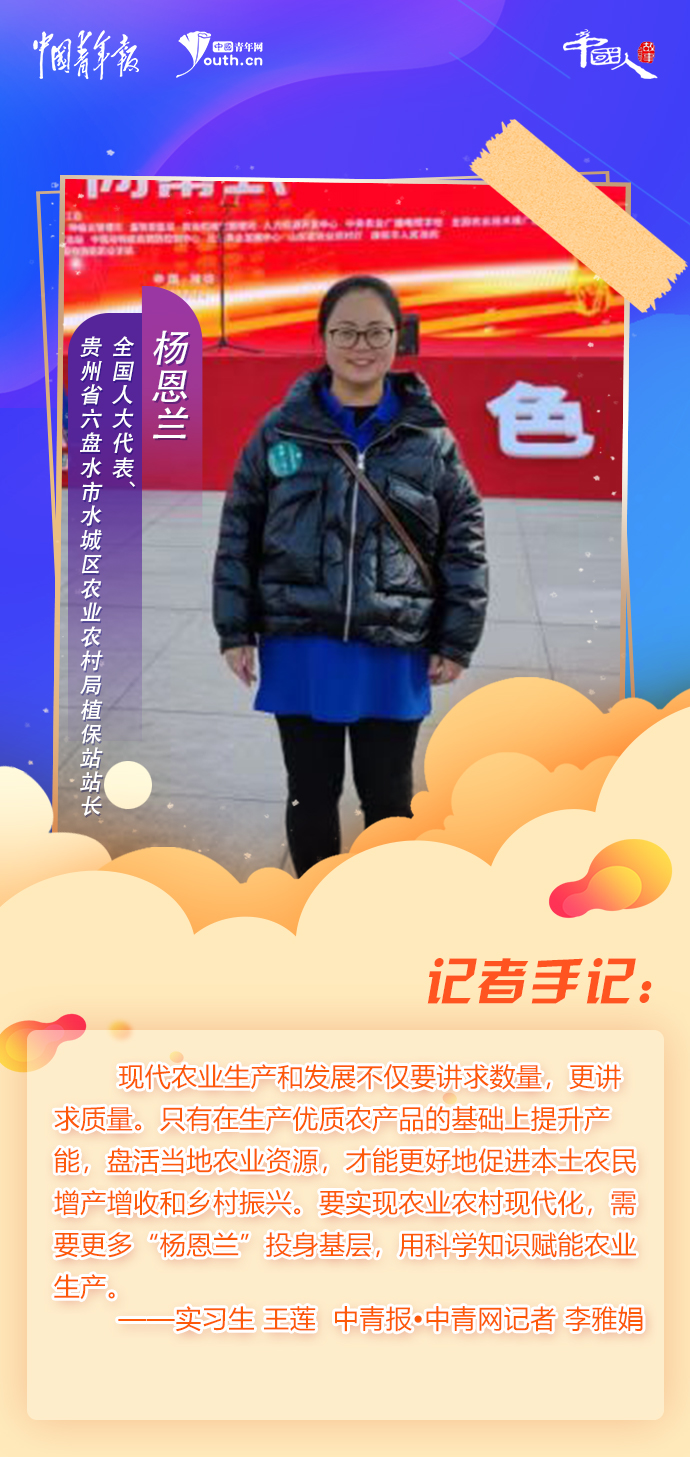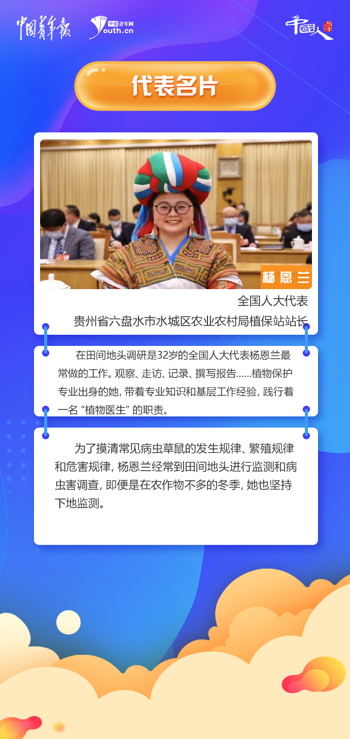 在田間地頭調研是32歲的全國人大代表楊恩蘭(lan) 最常做的工作。觀察、走訪、記錄、撰寫(xie) 報告……植物保護專(zhuan) 業(ye) 出身的她,帶著專(zhuan) 業(ye) 知識和基層工作經驗,踐行著一名“植物醫生”的職責。