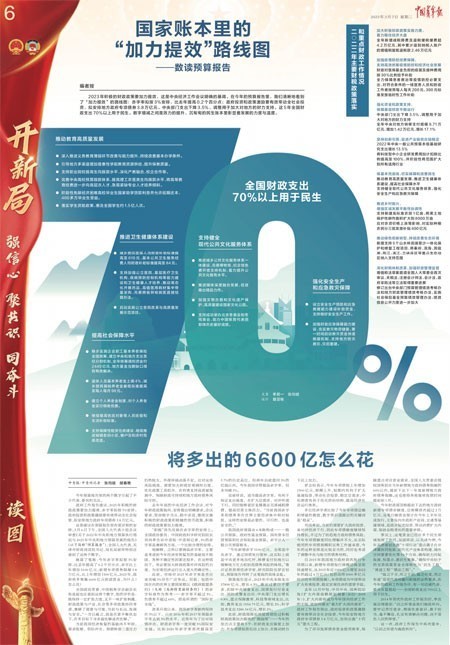 3月7日,《中國青年報》兩(liang) 會(hui) 特刊推出可視化版麵解讀預算報告中的重要數據“70%”——連續5年全國財政支出70%以上用於(yu) 民生。通過突出這一大數據,凸顯本屆政府執政為(wei) 民的理念。整版通過數據的變化,解讀預算報告,呈現“積極財政政策提力增效的路線圖”。