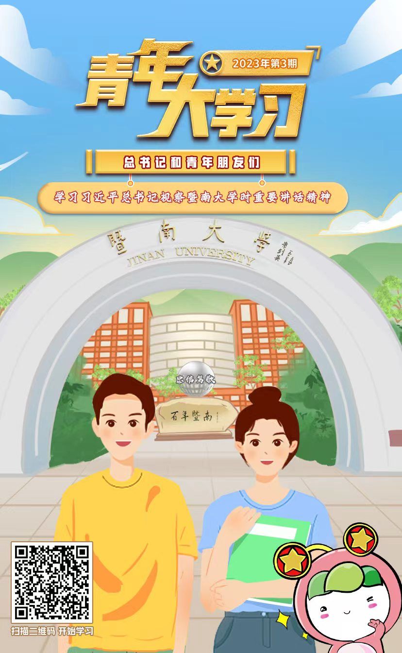 中國青年報客戶端訊(中青報·中青網記者 杜沂蒙)3月13日,由共青團中央宣傳(chuan) 部和中國青年報·中青在線聯合推出的“青年大學習(xi) ”網上主題團課2023年第3期上線。2018年10月24日,習(xi) 近平總書(shu) 記到暨南大學視察並指出,我國有5000多萬(wan) 海外僑(qiao) 胞,這是我國發展的一個(ge) 獨特優(you) 勢,改革開放有海外僑(qiao) 胞的一份功勞,暨南大學要堅持自己的辦學特色,把學校辦得更好,為(wei) 海外僑(qiao) 胞回祖國學習(xi) 、傳(chuan) 承中華文化創造更好條件。本期“青年大學習(xi) ”網上主題團課“學習(xi) 習(xi) 近平總書(shu) 記視察暨南大學時重要講話精神”,帶領廣大團員青年一起學習(xi) 相關(guan) 內(nei) 容。截至目前,“青年大學習(xi) ”2023年兩(liang) 會(hui) 特輯參與(yu) 學習(xi) 互動的人數為(wei) 57738080人,總點擊量為(wei) 113980661。