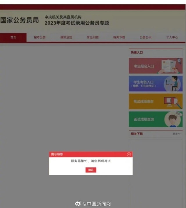 另據中新網報道,14日晚間,不少考生在網站曬出剛剛查到的2023國考筆試成績。一些網友反映2023國考專(zhuan) 題網頁上分數查詢通道擁擠,網頁顯示“服務器繁忙”。