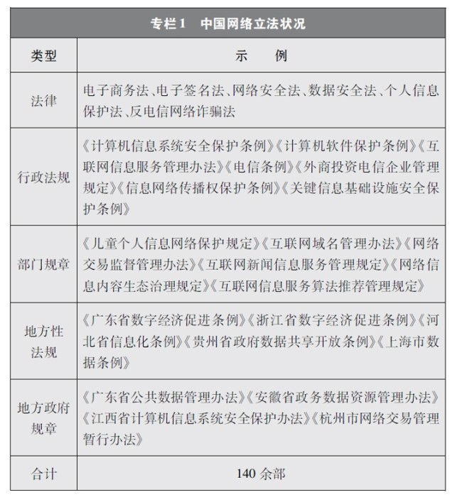 中國網絡立法隨著互聯網發展經曆了從(cong) 無到有、從(cong) 少到多、由點到麵、由麵到體(ti) 的發展過程。第一階段從(cong) 1994年至1999年,是接入互聯網階段。上網用戶和設備數量穩步增加。這一階段網絡立法主要聚焦於(yu) 網絡基礎設施安全,即計算機係統安全和聯網安全。第二階段從(cong) 2000年至2011年,是PC互聯網階段。隨著計算機數量逐步增加、上網資費逐步降低,用戶上網日益普遍,網絡信息服務迅猛發展。這一階段網絡立法轉向側(ce) 重網絡服務管理和內(nei) 容管理。第三階段從(cong) 2012年至今,是移動互聯網階段。這一階段網絡立法逐步趨向全麵涵蓋網絡信息服務、信息化發展、網絡安全保護等在內(nei) 的網絡綜合治理。在這一進程中,中國製定出台網絡領域立法140餘(yu) 部,基本形成了以憲法為(wei) 根本,以法律、行政法規、部門規章和地方性法規、地方政府規章為(wei) 依托,以傳(chuan) 統立法為(wei) 基礎,以網絡內(nei) 容建設與(yu) 管理、網絡安全和信息化等網絡專(zhuan) 門立法為(wei) 主幹的網絡法律體(ti) 係,為(wei) 網絡強國建設提供了堅實的製度保障。
