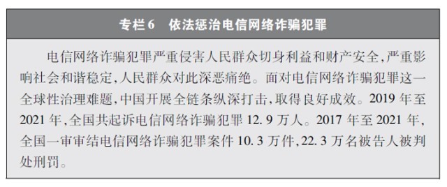 加大網絡犯罪懲治力度。隨著互聯網技術的快速發展,傳(chuan) 統犯罪加速向以互聯網為(wei) 媒介的非接觸式犯罪轉變,電信網絡詐騙、網絡賭博、網絡淫穢色情等涉網違法犯罪多發。中國依法辦理新型網絡犯罪案件。連續多年開展“淨網行動”,嚴(yan) 厲打擊群眾(zhong) 反映強烈的黑客攻擊破壞、侵犯公民個(ge) 人信息等違法犯罪活動。持續推進“雲(yun) 劍”“斷卡”“斷流”“拔釘”等專(zhuan) 項行動,打擊套路貸、校園貸、“以房養(yang) 老”、“投資養(yang) 老”等電信網絡詐騙犯罪,依法懲處為(wei) 電信網絡詐騙犯罪團夥(huo) 提供互聯網接入、域名注冊(ce) 、服務器托管、移動互聯網應用程序製作開發、網絡支付、引流推廣等服務支撐的黑灰產(chan) 業(ye) 。完善國家反詐大數據平台和反詐移動互聯網應用程序,建設國家涉詐黑樣本庫,完善快速止付凍結機製、涉詐資金返還機製。堅決(jue) 打擊網絡賭博犯罪行為(wei) ,從(cong) 嚴(yan) 治理網絡淫穢色情。網絡犯罪治理工作取得明顯成效,人民群眾(zhong) 安全感有效提升,社會(hui) 更加和諧穩定。