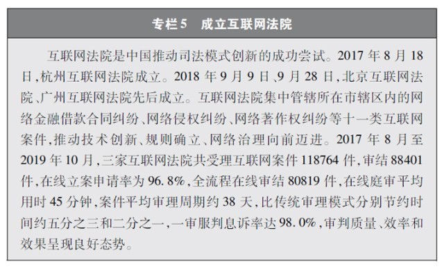 積極探索司法活動與(yu) 網絡技術深度融合的新路徑、新領域、新模式,讓社會(hui) 正義(yi) “提速”。積極推行大數據、雲(yun) 計算、人工智能、區塊鏈等現代科技在訴訟服務、審判執行、司法管理等領域的深度應用,先行先試構建中國特色的網絡司法模式。鼓勵各地法院因地製宜,結合當地互聯網產(chan) 業(ye) 發展情況和網絡糾紛特點,探索具有地域特色的新型互聯網審判機製。相繼設立杭州、北京、廣州互聯網法院,探索實行“網上案件網上審理”。大力推進數字檢察工作,堅持大數據賦能法律監督,係統整合各類辦案數據,積極探索構建大數據法律監督模型和平台,努力推動個(ge) 案辦理式監督和類案治理式監督相結合,為(wei) 新時代法律監督提質增效。網絡司法的新模式標誌著中國特色社會(hui) 主義(yi) 司法製度在網絡領域進一步發展完善,逐漸成為(wei) 中國司法的一張亮麗(li) 名片。