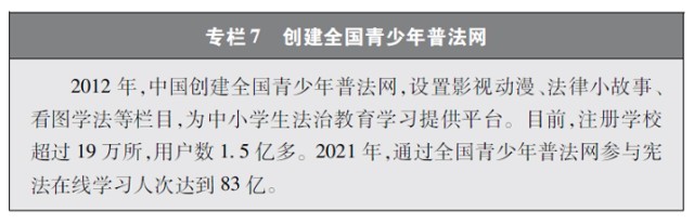 加強青少年網絡法治宣傳(chuan) 教育。青少年是祖國的未來、民族的希望。青少年網民在中國網民中的占比逐步增長。作為(wei) 互聯網的“原住民”,青少年是網上學習(xi) 、交流、生活最活躍的參與(yu) 者、實踐者,其合法權益也更易受到網絡違法活動的侵害。中國從(cong) 保護青少年網絡權益,促進青少年健康成長、全麵發展出發,遵循青少年身心發展規律,貼近青少年學習(xi) 生活實際,聚焦網絡沉迷、網絡欺淩、網絡淫穢色情信息等重點問題,通過普法微綜藝、兒(er) 童普法話劇、網絡普法故事廣播、網絡普法雲(yun) 課堂、學法用法知識競賽、法治副校長進校園、編寫(xie) 網絡普法讀本等生動活潑、豐(feng) 富多彩的形式開展法治宣傳(chuan) 教育,逐步形成了政府、社會(hui) 、學校、家庭相結合的法治宣傳(chuan) 教育格局,為(wei) 提升青少年網民法治意識和網絡安全素養(yang) 提供了全麵保障。