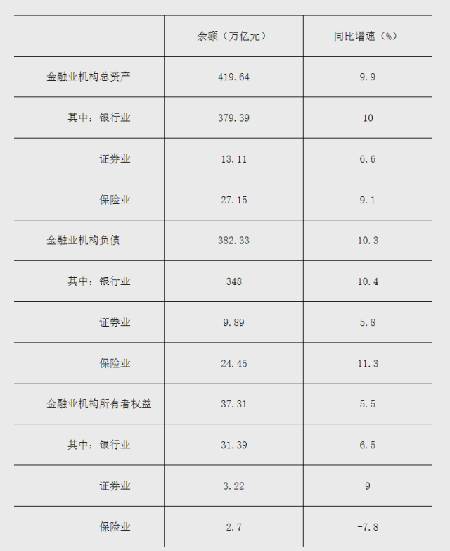 金融業(ye) 機構負債(zhai) 為(wei) 382.33萬(wan) 億(yi) 元,同比增長10.3%,其中,銀行業(ye) 機構負債(zhai) 為(wei) 348萬(wan) 億(yi) 元,同比增長10.4%;證券業(ye) 機構負債(zhai) 為(wei) 9.89萬(wan) 億(yi) 元,同比增長5.8%;保險業(ye) 機構負債(zhai) 為(wei) 24.45萬(wan) 億(yi) 元,同比增長11.3%。