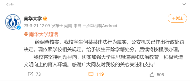 央視網消息:據@南華大學 微博最新消息,經調查核實,該校學生何某某違法行為(wei) 屬實,公安機關(guan) 已作出行政處罰決(jue) 定。現依照學校相關(guan) 規定,給予該生開除學籍處分,後續將按程序辦理。